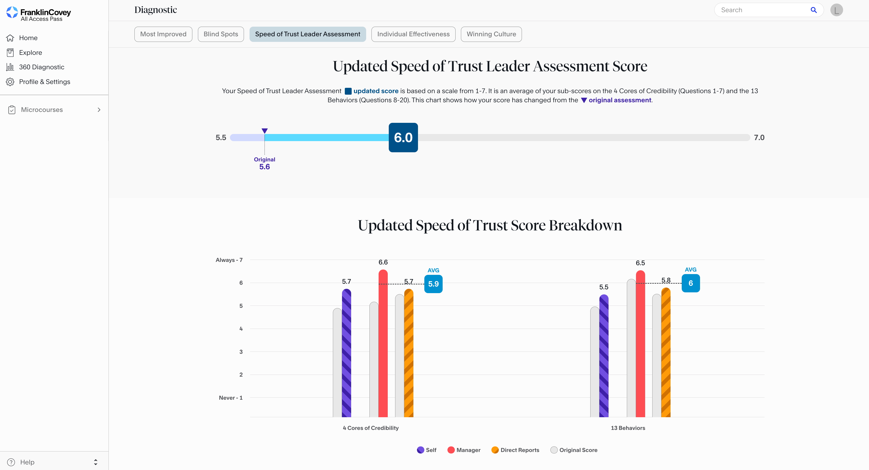 Das Post-Learning 360 Diagnostic with the SOT Leader Addendum beinhaltet zwei aktualisierte Visualisierungen: den aktualisierten Speed of Trust Leader Assessment Score und den aktualisierten Speed of Trust Score-Aufschlüsselung. Letzteres hebt die Vertrauensbewertungen des Managers hervor, insbesondere, wenn mindestens ein Manager eingereicht wurde. Es hebt auch die Ergebnisse einer anderen Gruppe hervor, z. B. direkt unterstellte Mitarbeiter, wenn es in einer bestimmten Gruppe drei oder mehr Beiträge gibt.